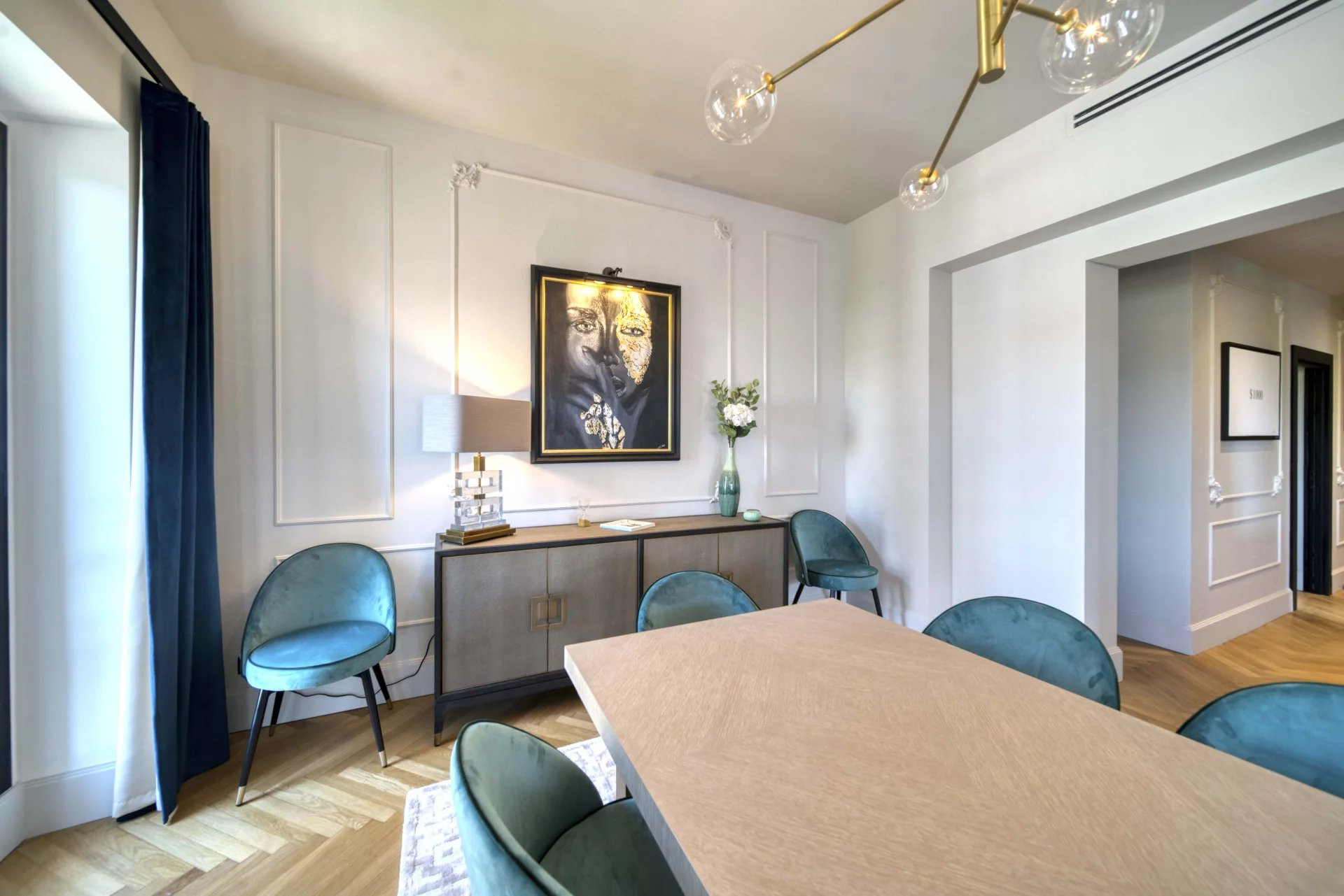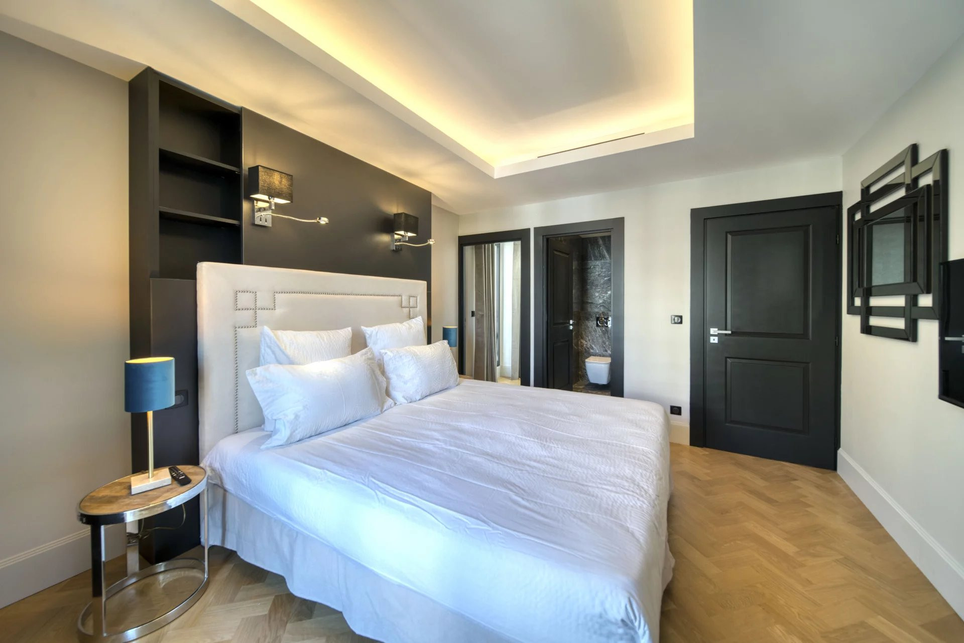 Au 3e étage d'un immeuble bourgeois de la Croisette, cet appartement de 195 m² dispose de 5 chambres en suite pouvant accueillir jusqu'à 10 invités. Les pieces de vie sont baignées de lumière naturelle, et offrent une vue imprenable sur le palais des festivals et le vieux port.