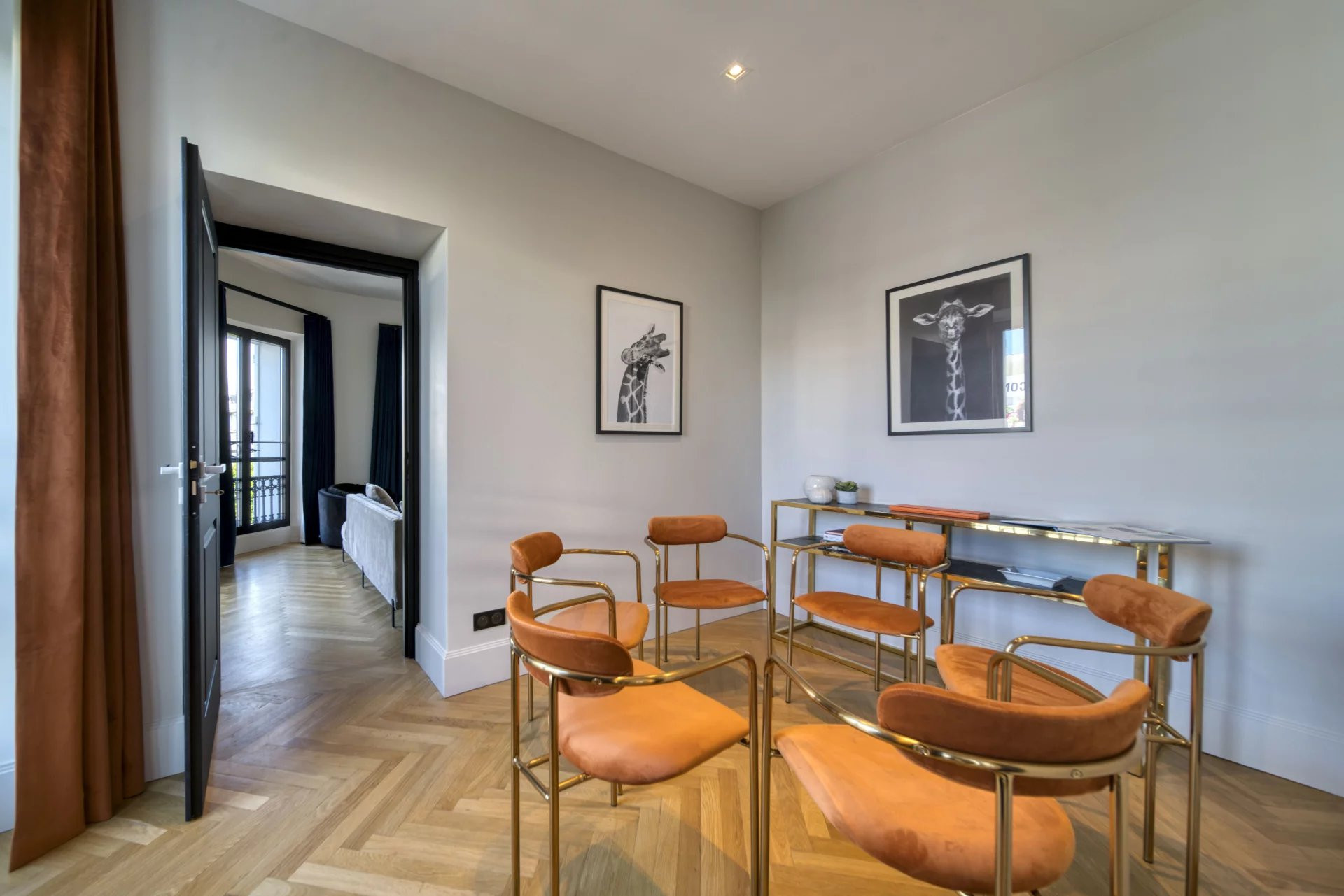 Sa belle hauteur sous plafonds, ses corniches élégantes et son parquet en pointe de Hongrie allient parfaitement charme historique et confort moderne.