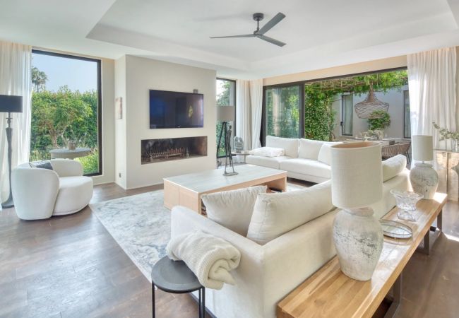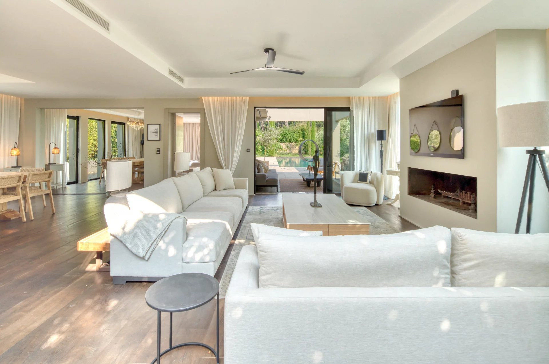 La villa dispose de cinq suites, chacune avec salle de bain privative et lit king-size, réparties sur trois niveaux. Le salon principal avec cheminée, la salle à manger et la cuisine ouverte s’ouvrent sur une terrasse ombragée avec coin lounge, face à la piscine à débordement chauffée. Les grandes baies vitrées pleine hauteur invitent la lumière à entrer tout au long de la journée, créant une connexion fluide entre intérieur et extérieur.