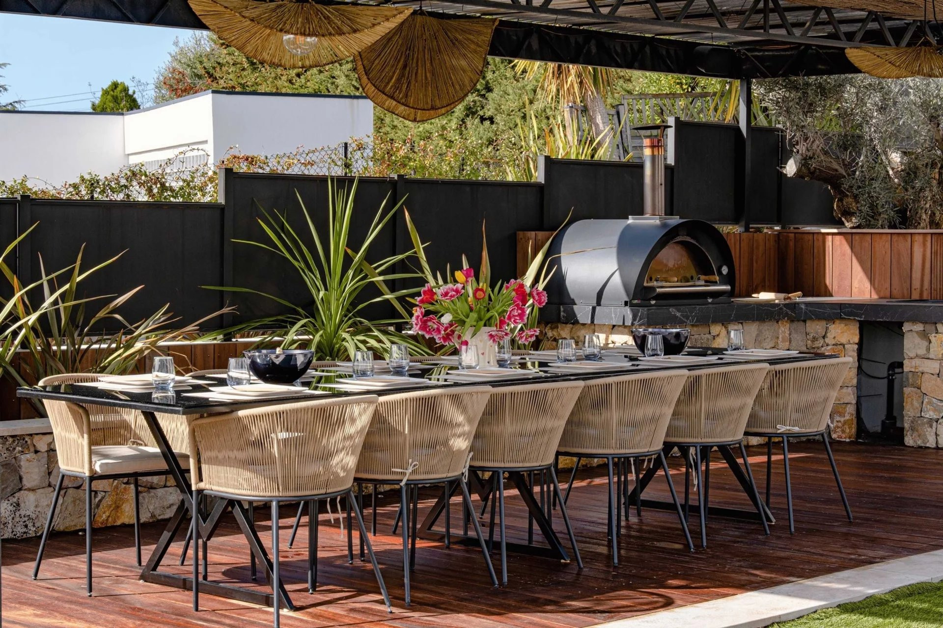 -Salle à manger sous une verrière complètement ouvrable sur une terrasse aménagée en salle à manger d’été
