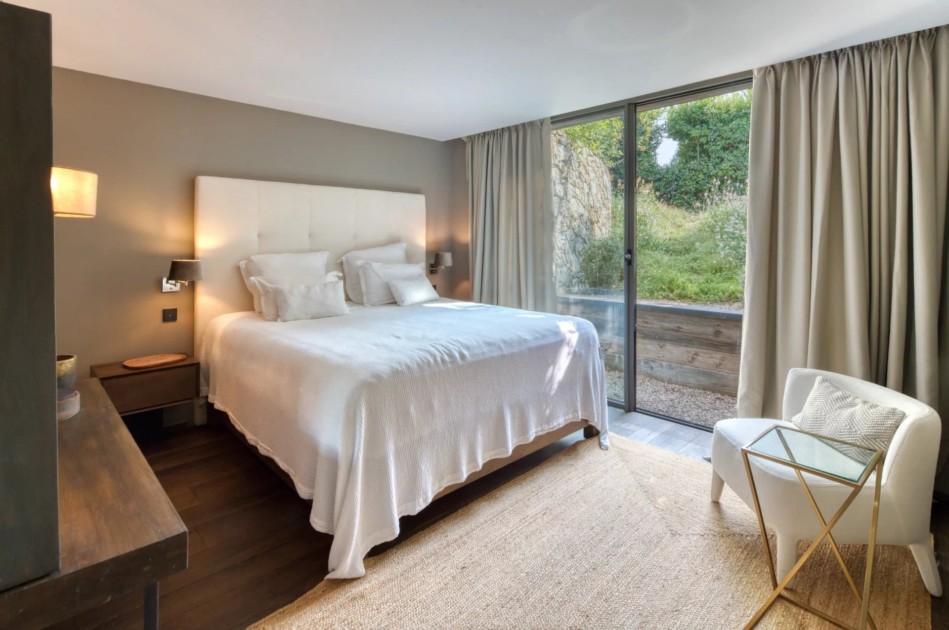 La villa dispose de cinq suites, chacune avec salle de bain privative et lit king-size, réparties sur trois niveaux. Le salon principal avec cheminée, la salle à manger et la cuisine ouverte s’ouvrent sur une terrasse ombragée avec coin lounge, face à la piscine à débordement chauffée. Les grandes baies vitrées pleine hauteur invitent la lumière à entrer tout au long de la journée, créant une connexion fluide entre intérieur et extérieur.