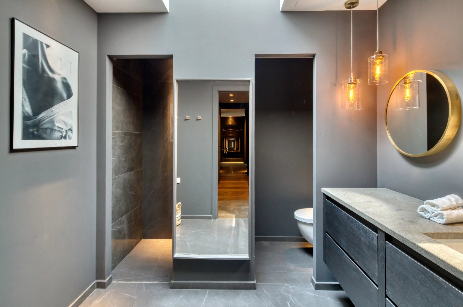 En rez-de-jardin, les extérieurs se prolongent par un pool house avec cuisine d’été, une salle à manger extérieure, un terrain de pétanque, trois grandes pelouses, un vaste parking privé pavé, ainsi qu’un garage pour deux voitures. Le niveau inférieur accueille un espace bien-être complet avec salle de sport, sauna et home cinéma.