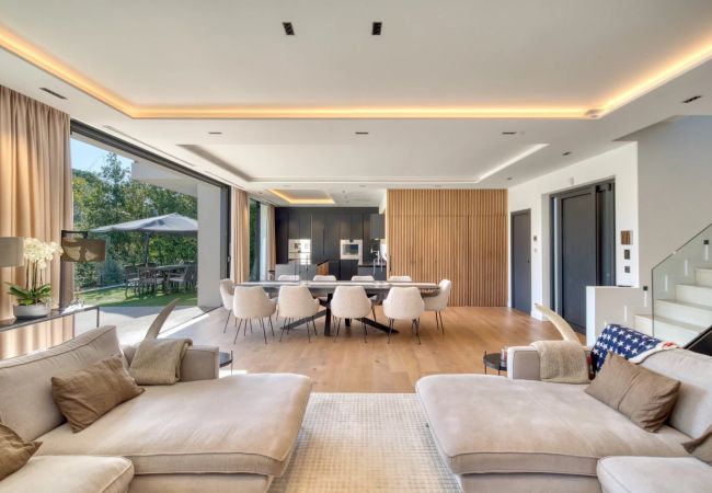 La villa dispose de cinq suites, chacune avec salle de bain privative et lit king-size, réparties sur trois niveaux. Le salon principal avec cheminée, la salle à manger et la cuisine ouverte s’ouvrent sur une terrasse ombragée avec coin lounge, face à la piscine à débordement chauffée. Les grandes baies vitrées pleine hauteur invitent la lumière à entrer tout au long de la journée, créant une connexion fluide entre intérieur et extérieur.
