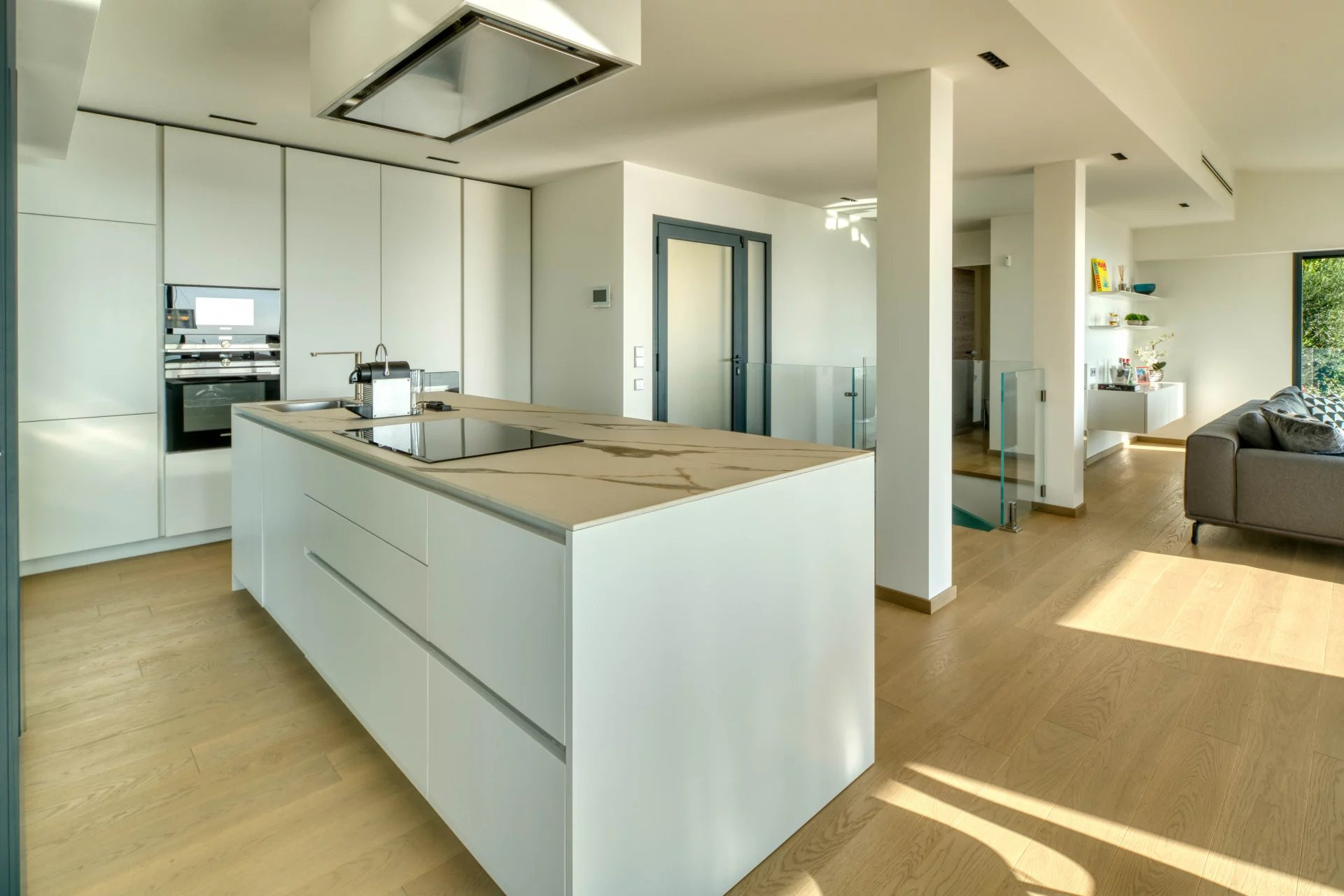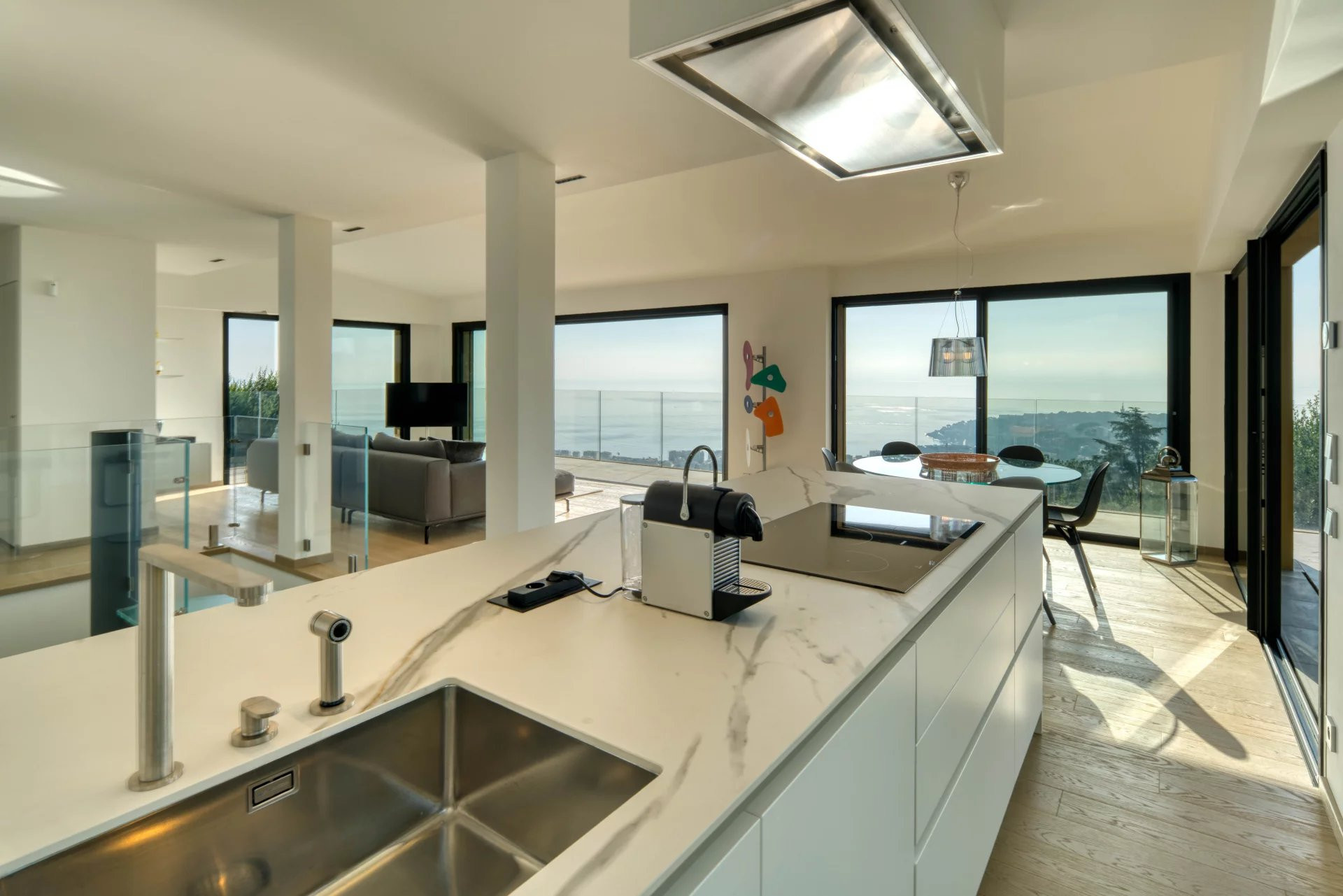 Organisée sur deux niveaux, elle comprend un hall d'entrée donnant sur le séjour à la vue panoramique sur la mer et la ville, cuisine ouverte et équipée et SANS vis-à-vis.