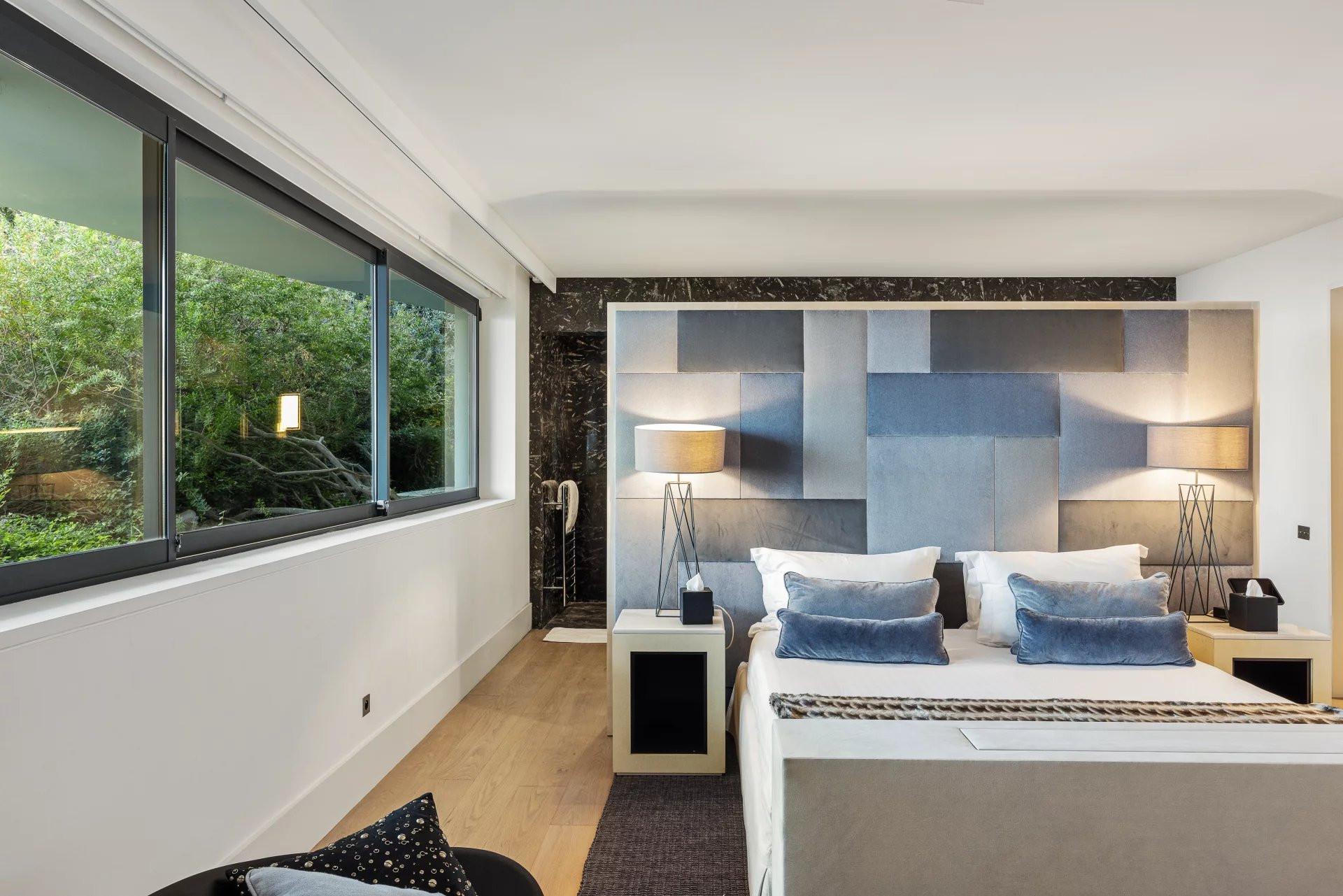 Disposant de 6 chambres en suite, elle accueille jusque 12 invités. Ses vastes espaces intérieurs de la villa sont baignés de lumière naturelle grâce aux grandes baies vitrées qui ouvrent sur des vues imprenables.