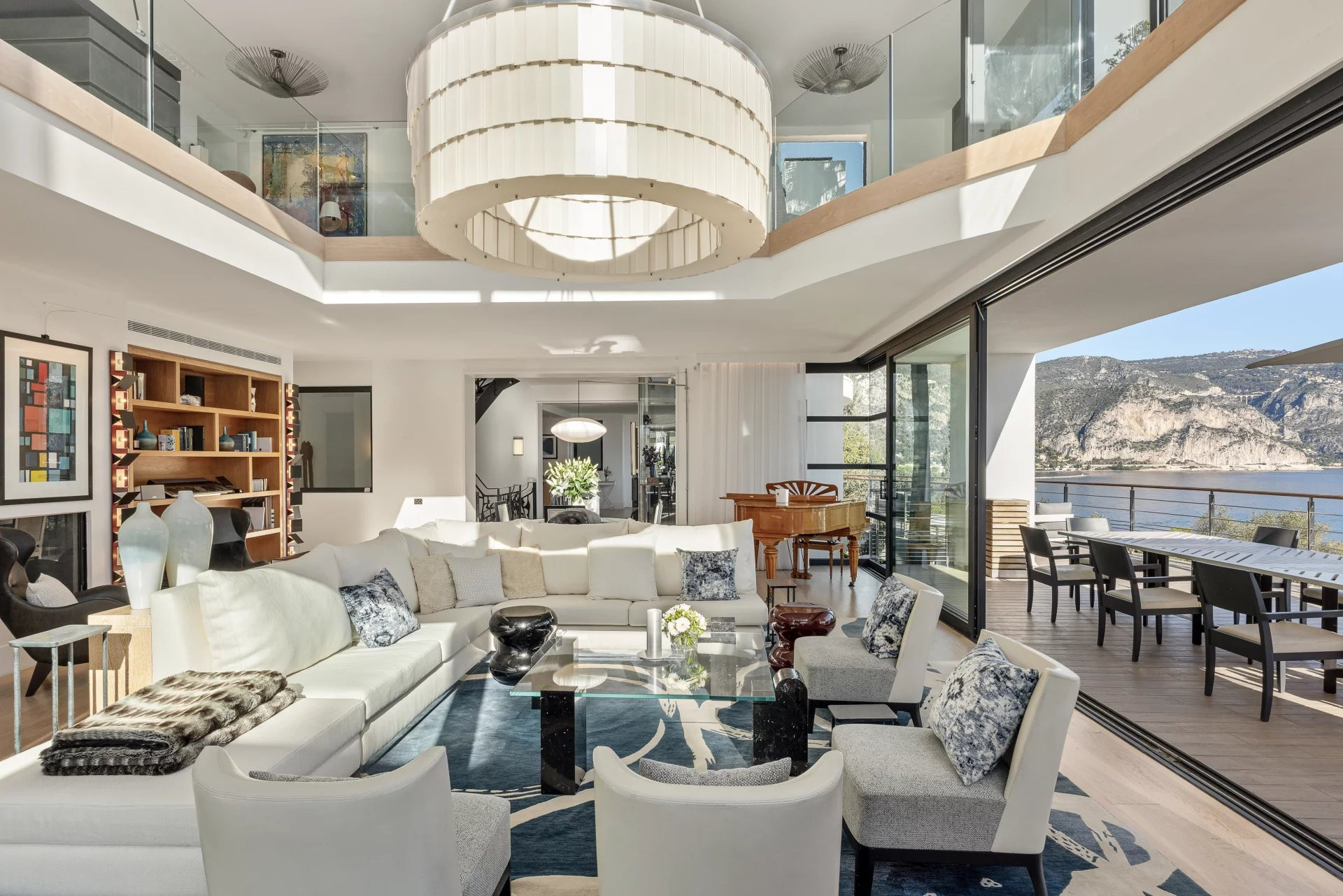 Salon spacieux de 150 m² avec home cinéma, bibliothèque et deux salons supplémentaires.
