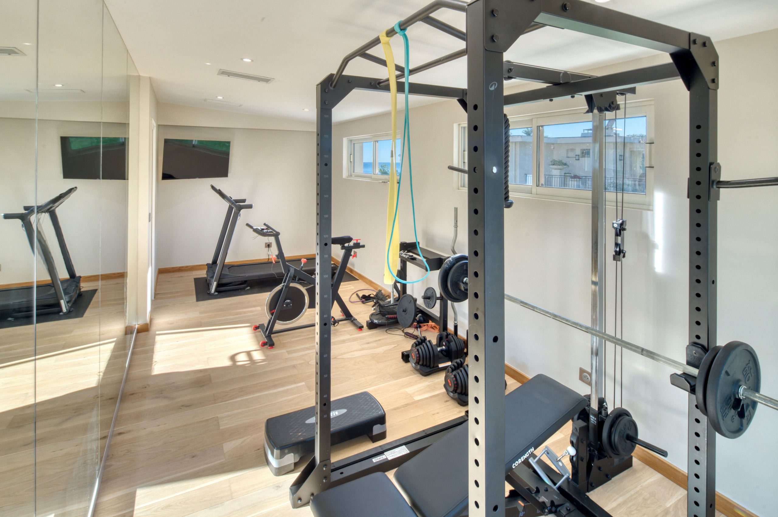 The accommodation is equipped with the following items: lift, garden, garden furniture, fenced garden, terrace, washing machine, dryer, barbecue, iron, safe, internet (Wi-Fi), hair dryer, balcony, gym / fitness centre, alarm, central heating, air conditioning throughout the house, private heated swimming pool, garage and car park the same building, 8 TVs.