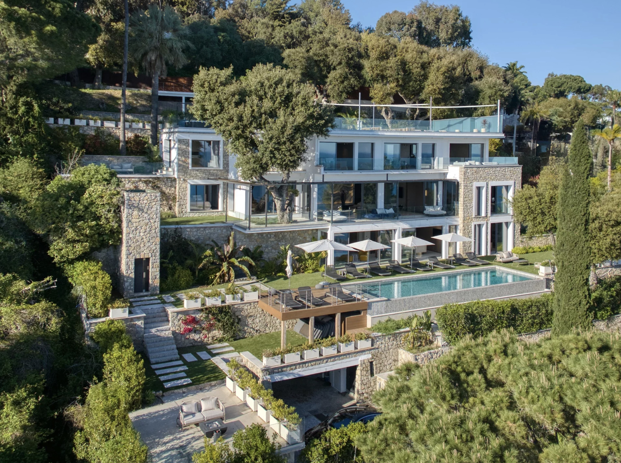 The villa is 600 m². It has views of waterfront and the mountain.