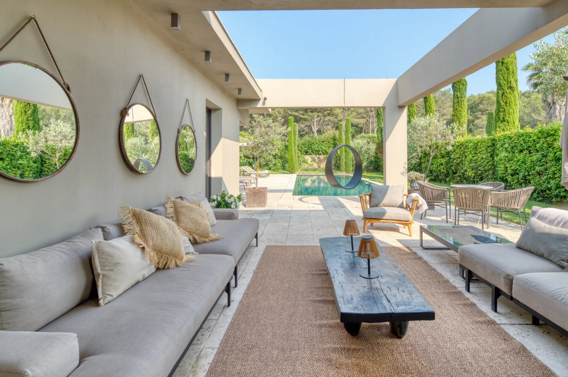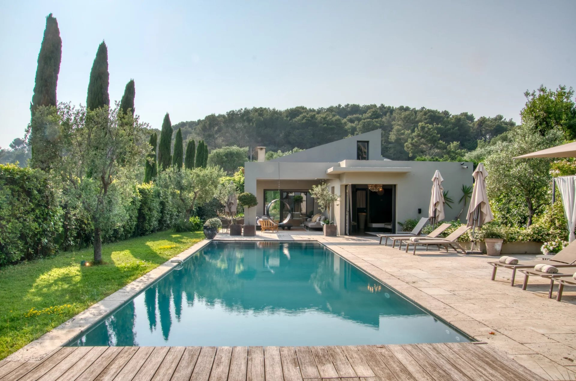 The villa in Mougins has 4 bedrooms and has capacity for 8 people. The villa is tastefully-furnished, is a new build, and is 298 m². It has views of the garden and the swimming pool. The property is located 3 km from the golf course, 8 km from the city, 8 km from the train station, 10 km from the sand beach, 23 km from the airport. The house is situated in a family-friendly neighborhood surrounded by the forest.The accommodation is equipped with the following items: garden, garden furniture, fenced garden, terrace, washing machine, dryer, barbecue, fireplace, iron, internet (Wi-Fi), hair dryer, balcony, childrens area, gym / fitness centre, alarm, air conditioning throughout the house, private swimming pool, open-air parking the same building, TV.In the induction open plan kitchen, refrigerator, microwave, oven, freezer, dishwasher, dishes/cutlery, kitchen utensils, coffee machine, toaster, kettle and juicer are provided.